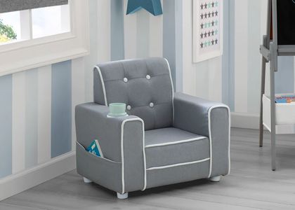 The Chelsea Kids Upholstered Chair with Cup Holder from Delta Children will give your little one a comfy place to read or relax. Button tufting on the back and contrasting piping adds grown-up style to this child-size chair while the built-in cup holder and storage pockets on the sides adds convenience. A chic addition to any children's bedroom, playroom or the living room, this chair is crafted with a sturdy wood base and a generous foam fill to ensure it is as comfortable as it is stylish. Chair coordinates with other items in the Chelsea Collection from Delta Children.