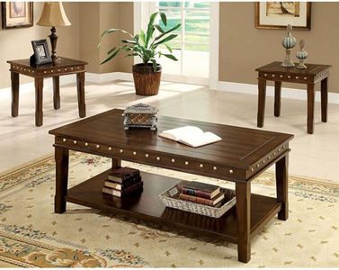 This attractive set of occasional tables features open shelving for display and storage, while nail-head trim accents are found along the sides. Finished in warm walnut.