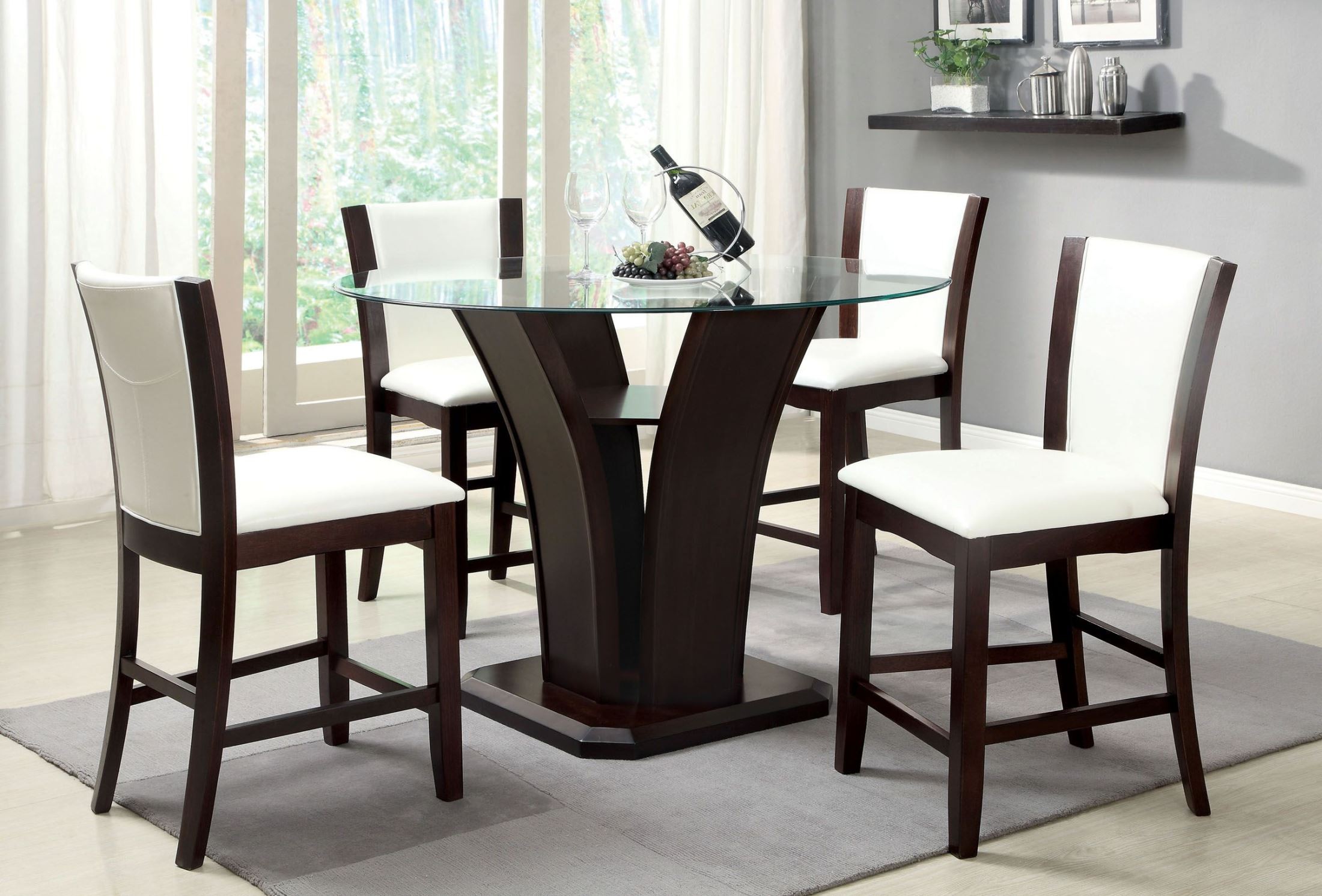 Add style to any dining area with this round counter height glass table in dark cherry finish. The Parson style chairs are available in two colors, which add a simple contrast to the striking, curved table base.Read More