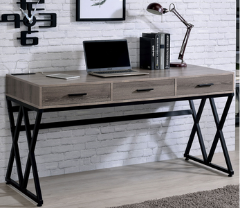 Industrial elements shine in this mixed-material desk. Double X-cross leg supports in sand black support a smooth, pale gray wooden table top. There's plenty of room for storage as three drawers are featured on the front, while an integrated USB and power outlet keep your computer powered up.Read More