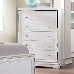 Glamour meets modern in this brilliant bedroom piece. The straight edges of this chest are delicately lined with mirror accents. As light bounces from the window to the trim and across the bright white finish.Read More