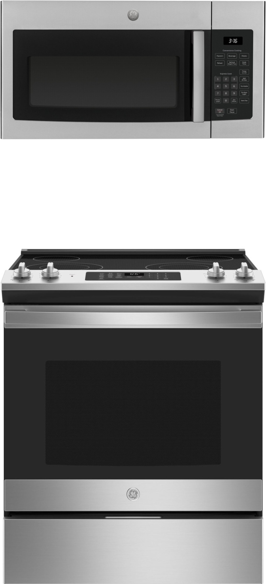 GE® 2 Piece Stainless Steel Kitchen Package with an over the range microwave and slide in electric range.Read More