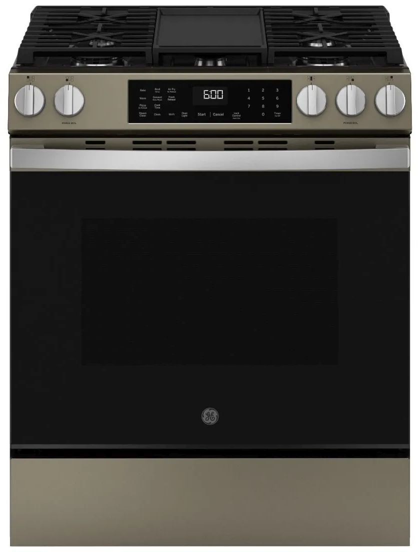 GE® 600 Series 30" Slate Slide-In Gas Range features EasyWash™ Oven Tray, Built-In WiFi, No Preheat Air Fry, Express Preheat, Edge-to-Edge Cooktop, Precise Simmer Burner, Center Oval Burner, Heavy-Duty, Dishwasher-Safe Grates, and Convection.Read More