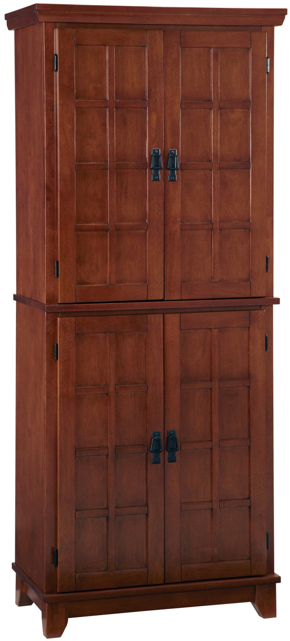Timeless style and exceptional craftsmanship. This Arts and Crafts Pantry by homestyles is constructed of solid oak and oak veneers in a warm, cottage oak finish with black-finished hardware. Two cabinet doors each open to two adjustable shelves. The pantry features framed doors showcasing raised wood lattice moldings.Read More