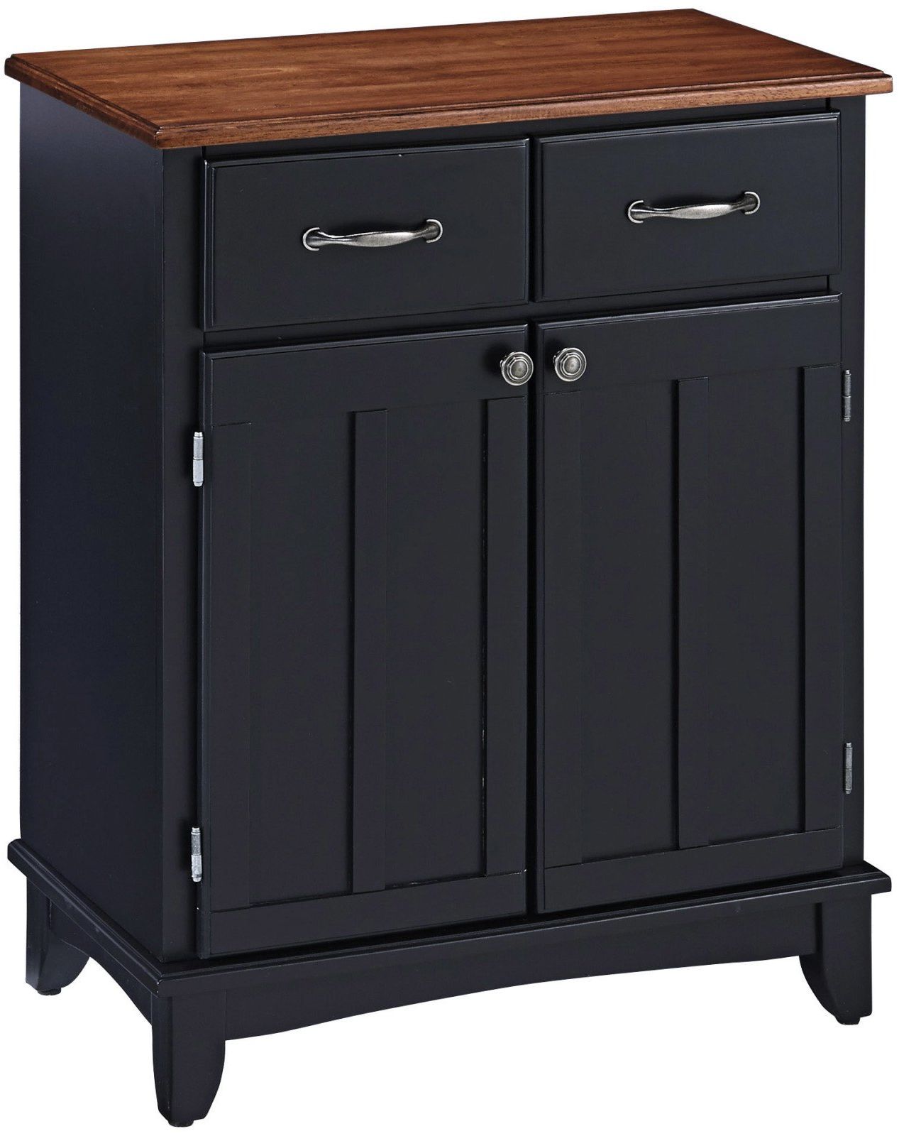 Small Server with Wood Top by homestyles is constructed of hardwood and wood products in a black finish with a medium cherry wood top. Features include two utility drawers, two wood-framed cabinet doors with an adjustable shelf inside for plenty of storage, and brushed steel hardware.