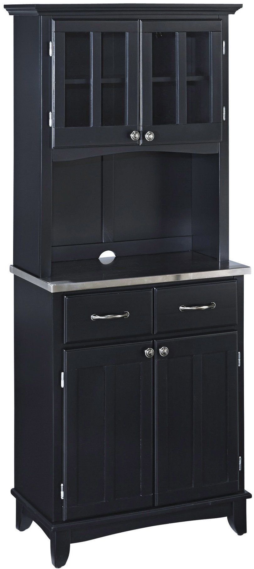 This Small Server with Stainless Steel Top and Two-door Hutch by homestyles is constructed of hardwood and wood products in a black finish with an 18-gauge stainless steel top. Features include two utility drawers, two wood-framed cabinet doors with an adjustable shelf inside for plenty of storageRead More