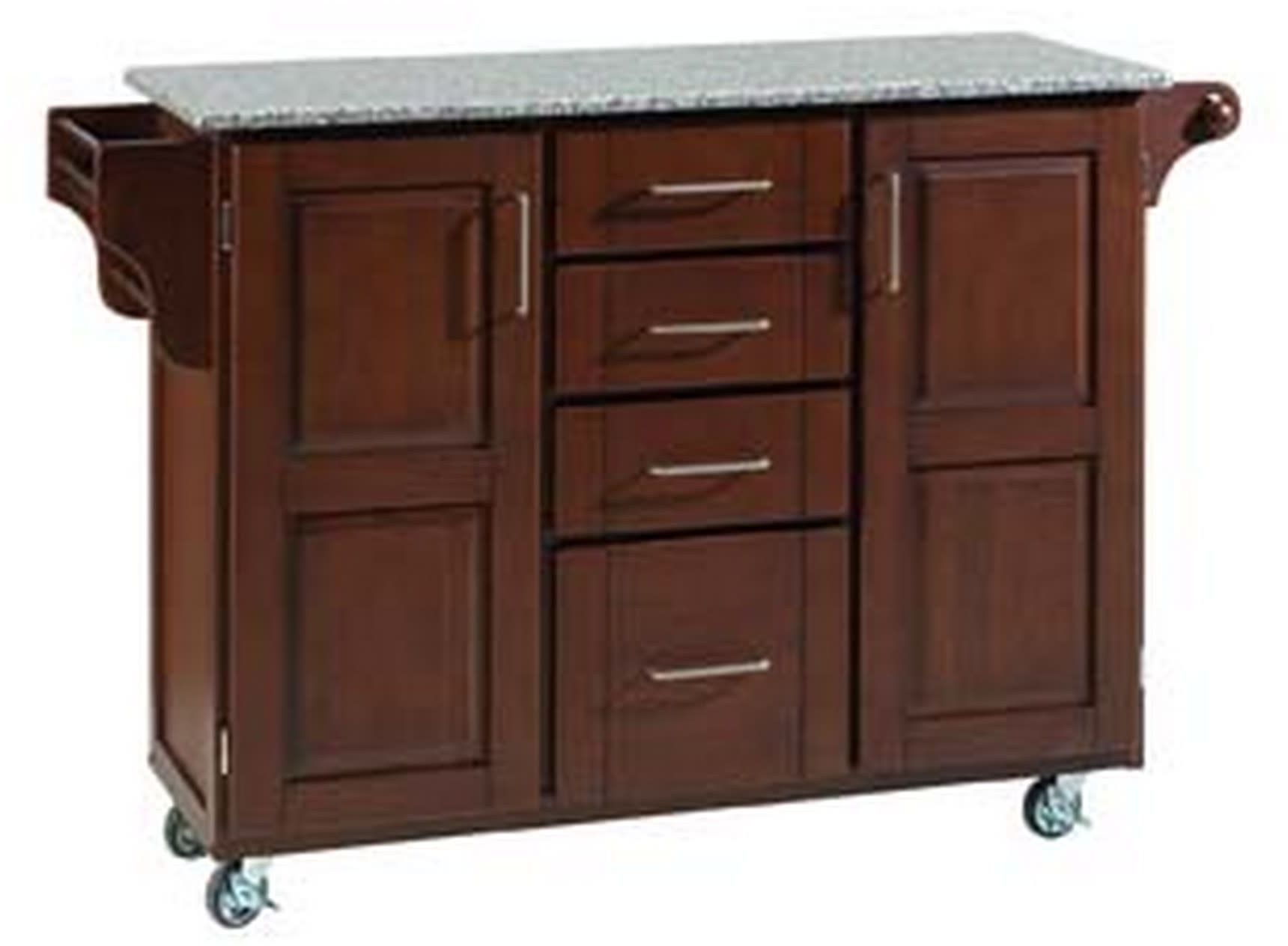 Create a stylish statement with the Create-a-Cart Kitchen Cart by homestyles. This versatile kitchen cart features a handsome cherry finish and a salt-and-pepper granite surface, which is ideal for preparing and serving meals. Great for a craft room too. Constructed of premium-level, solid wood. This cart offers plenty of storage with four large, easy glide drawers and two cabinet doors with customizable shelves inside and stylish recessed panels. The cart has a towel bar on each side and a spice rack. Locking rubber casters allow portability, with two locking for stability.
