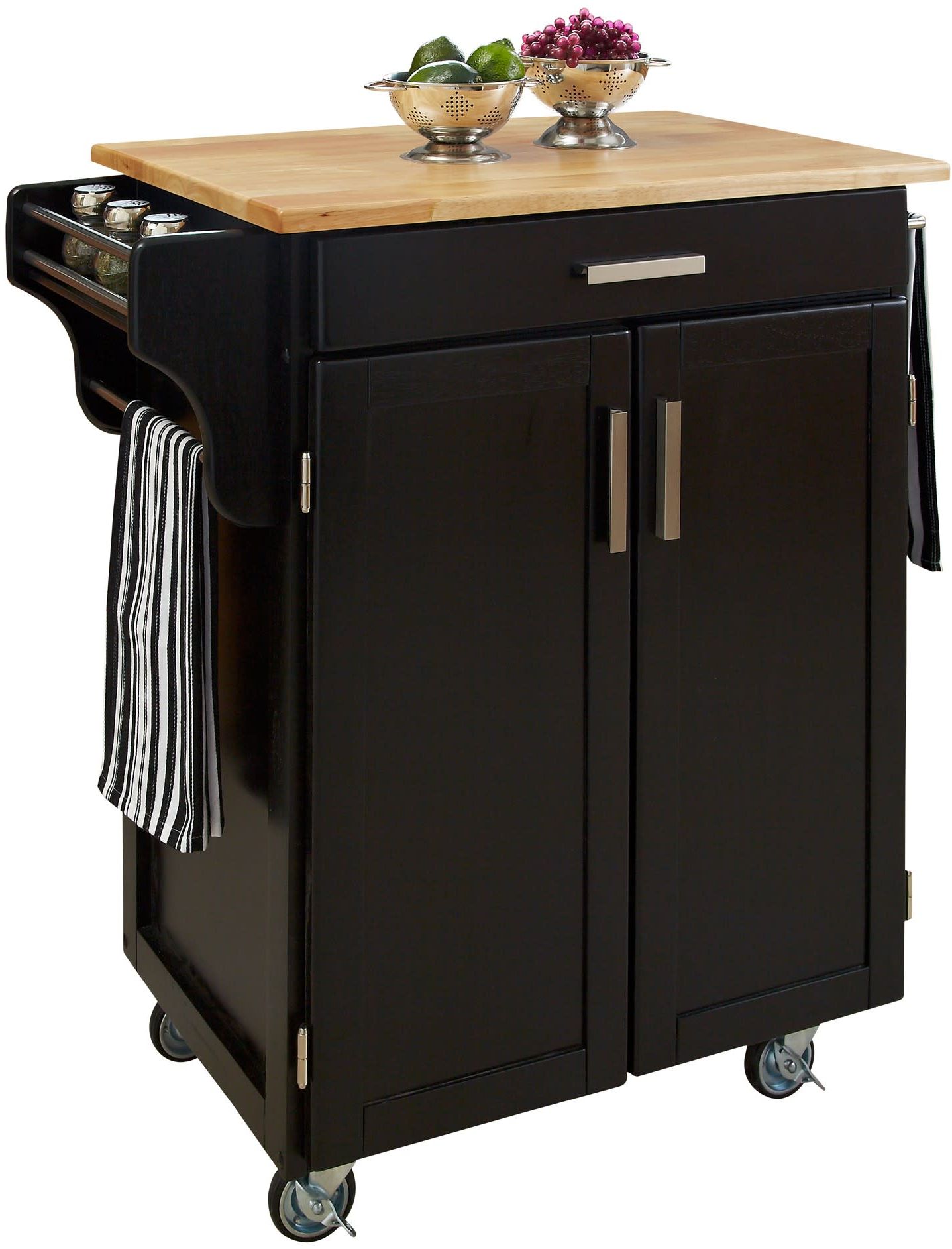 The homestyles Cuisine Kitchen Cart adds function and storage to kitchen and dining areas. The versatile cart features solid wood construction with a black finish and natural wood top. There is a roomy utility drawer and lower double-door cabinet with adjustable shelf. The cart is also outfitted with a handy spice rack and towel bars on each side. Brushed nickel hardware. Heavy duty rubber casters offer easy mobility and two lock for safety.
