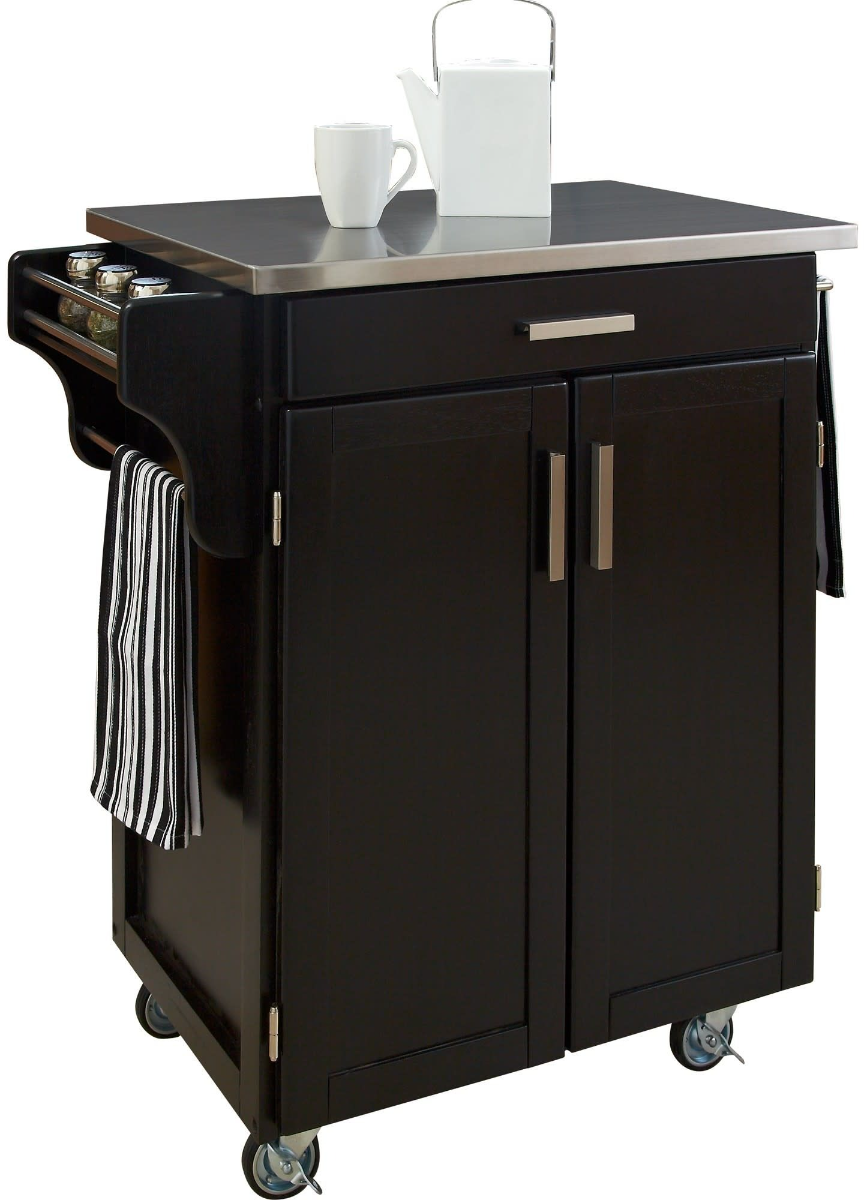 The homestyles Cuisine Kitchen Cart adds function and storage to kitchen and dining areas. The versatile cart features solid wood construction with a black finish and stainless steel top. There is a roomy utility drawer and lower double-door cabinet with adjustable shelf.Read More