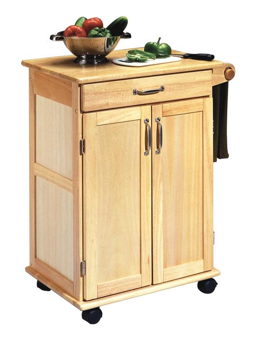 Practical and charming, the General Line Kitchen Cart by homestyles is crafted of solid hardwood and engineered wood construction in a natural finish with natural top. The cart features an easy-open utility drawer on metal glides and a double-door storage cabinet with an adjustable shelf. There is a paper towel holder with industrial-sized casters (two locking).