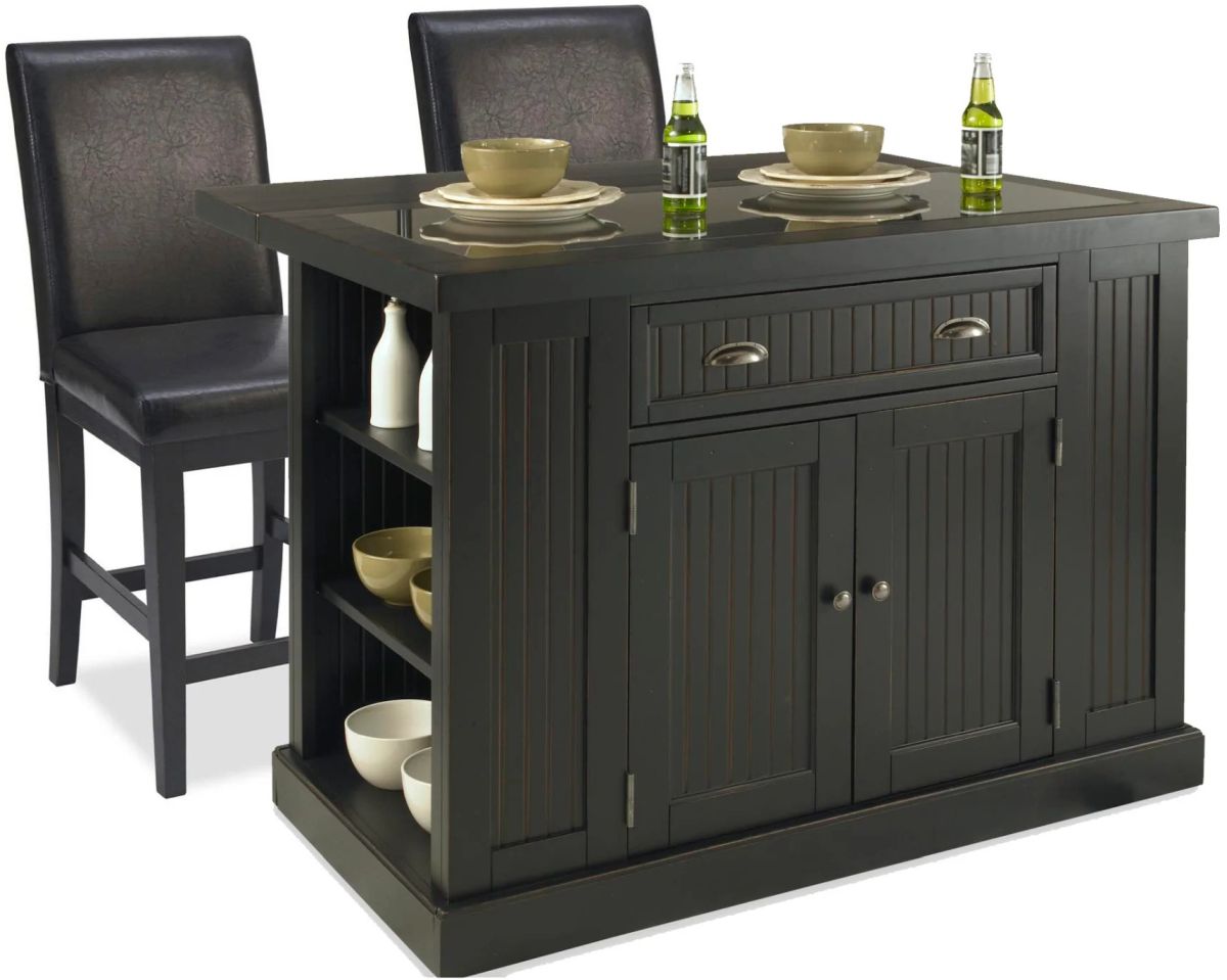 Add a luxurious and highly functional centerpiece to your kitchen with the Nantucket 3-piece Kitchen Island Set by homestyles in a premium, distressed black finish with hand-rubbed wainscot panels and edges. This impressive kitchen island features a lavish black 0.75" granite inlay and a drop leaf that extends the depth to 37" for extra dining or prep space. The solid hardwood and engineered wood construction gives this set superb durability. In addition, this kitchen island offers plenty of room for your kitchen essentials in a single drawer with antique brushed nickel hardware, two cabinets with two adjustable shelves inside each, and two adjustable shelves on each side. The set includes two bar stools with a distressed black finish, vinyl backs and seats, and metal foot rests.