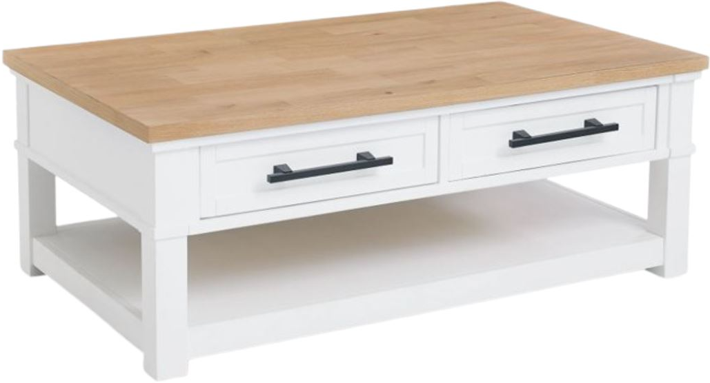 Casual style with substance. This two-tone coffee table raises the bar on comfortably cozy design. A sturdy silhouette with a classic white finish and black metal hardware exudes modern farmhouse vibes. The butcher block oak veneer top adds a relaxed aesthetic.Read More
