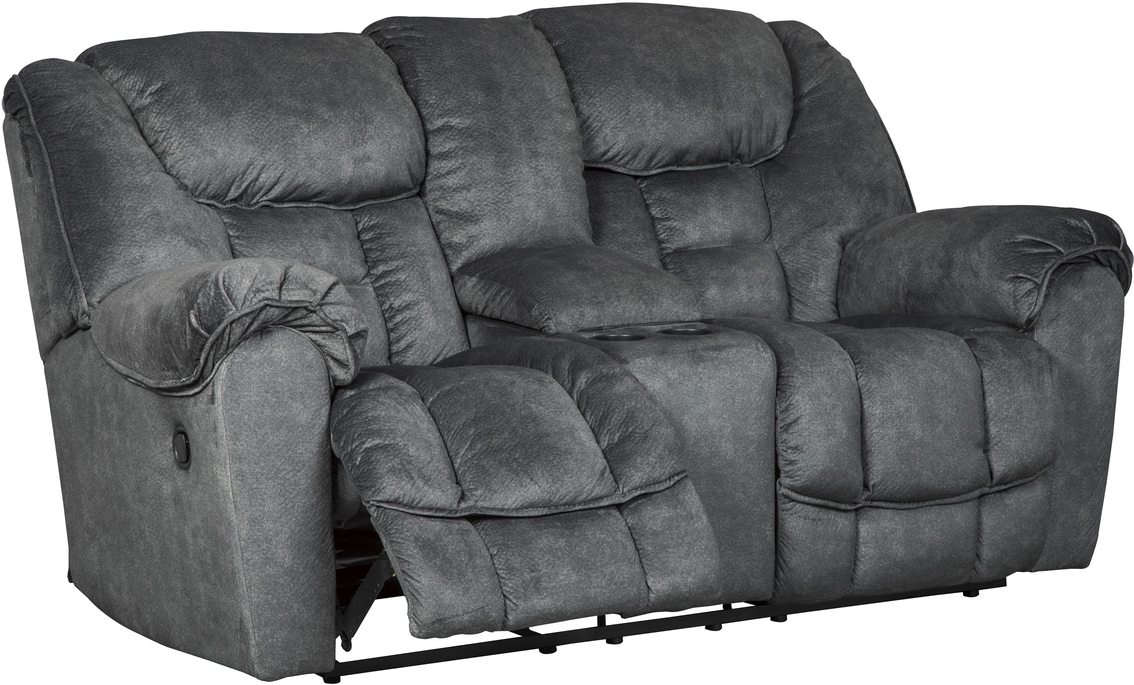 This granite-colored Capehorn console loveseat features dual-sided, pull-tab reclining, plush cushions, and soft upholstery for unmatched leisure good enough for two.