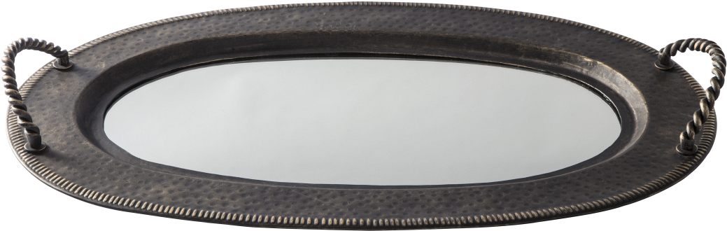 The Milena metal tray with built-in handles features an oval design bordered in decorative, raised detailing for style and function suitable for any occasion.