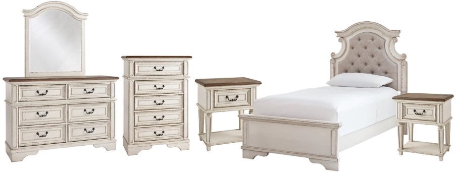 Includes twin bed (with upholstered headboard, footboard and rails), dresser with mirror, chest and 2 nightstands