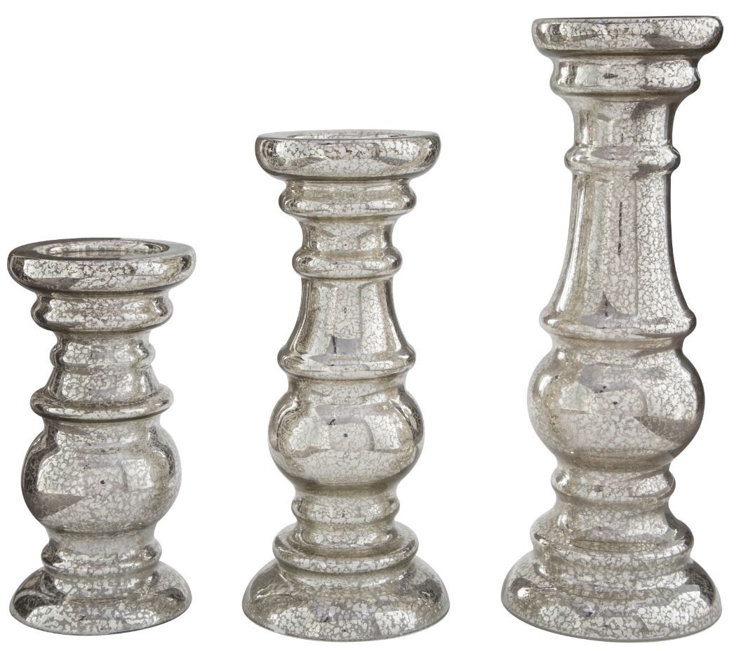 The turned silhouettes of this three-piece candle holder set create gorgeous negative space anywhere in your home. Silvertone finished mercury glass elevates the look with a hint of shine. With candles lit, an enticing aroma fills the air to complement your contemporary style.Read More